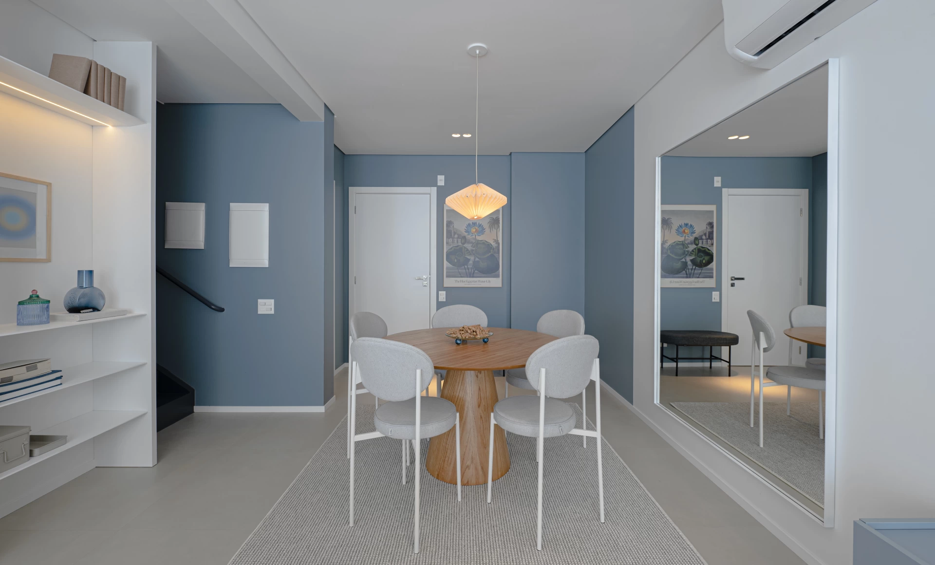 Uma estratégia fundamental para expandir o espaço, além de delimitar as áreas funcionais do apartamento, é utilizar as cores e a iluminação a seu favor. As tonalidades claras e neutras dão a sensação de amplitude e tranquilidade, permitindo, também, que você crie combinações com a paleta de cores do seu ambiente. Já os objetos de iluminação podem ser direcionados a pontos específicos no cômodo, garantindo aconchego e praticidade às suas atividades. Incluir espelhos de tamanhos variados também contribui para a ampliação do cômodo, refletindo a luz e as cores claras do ambiente.