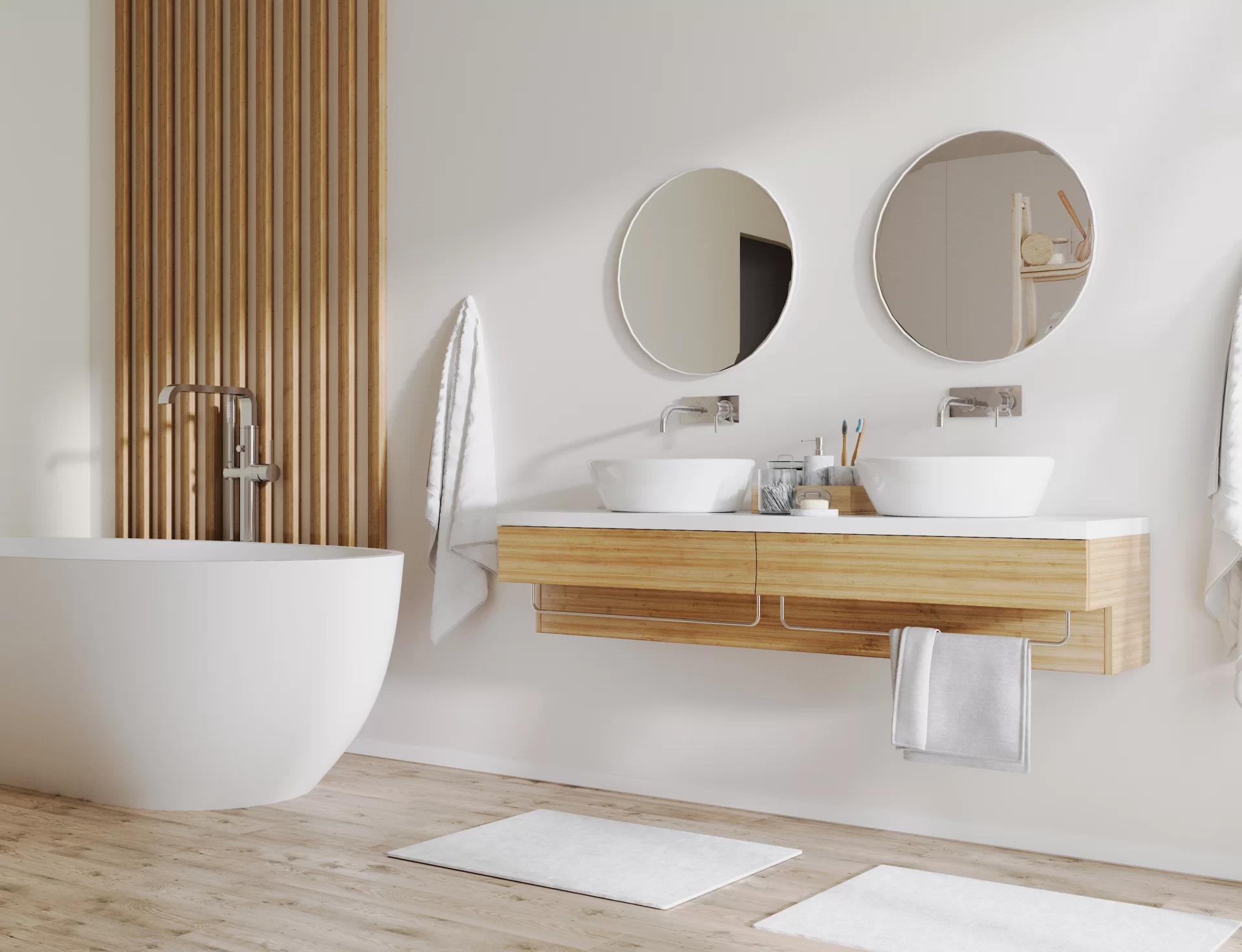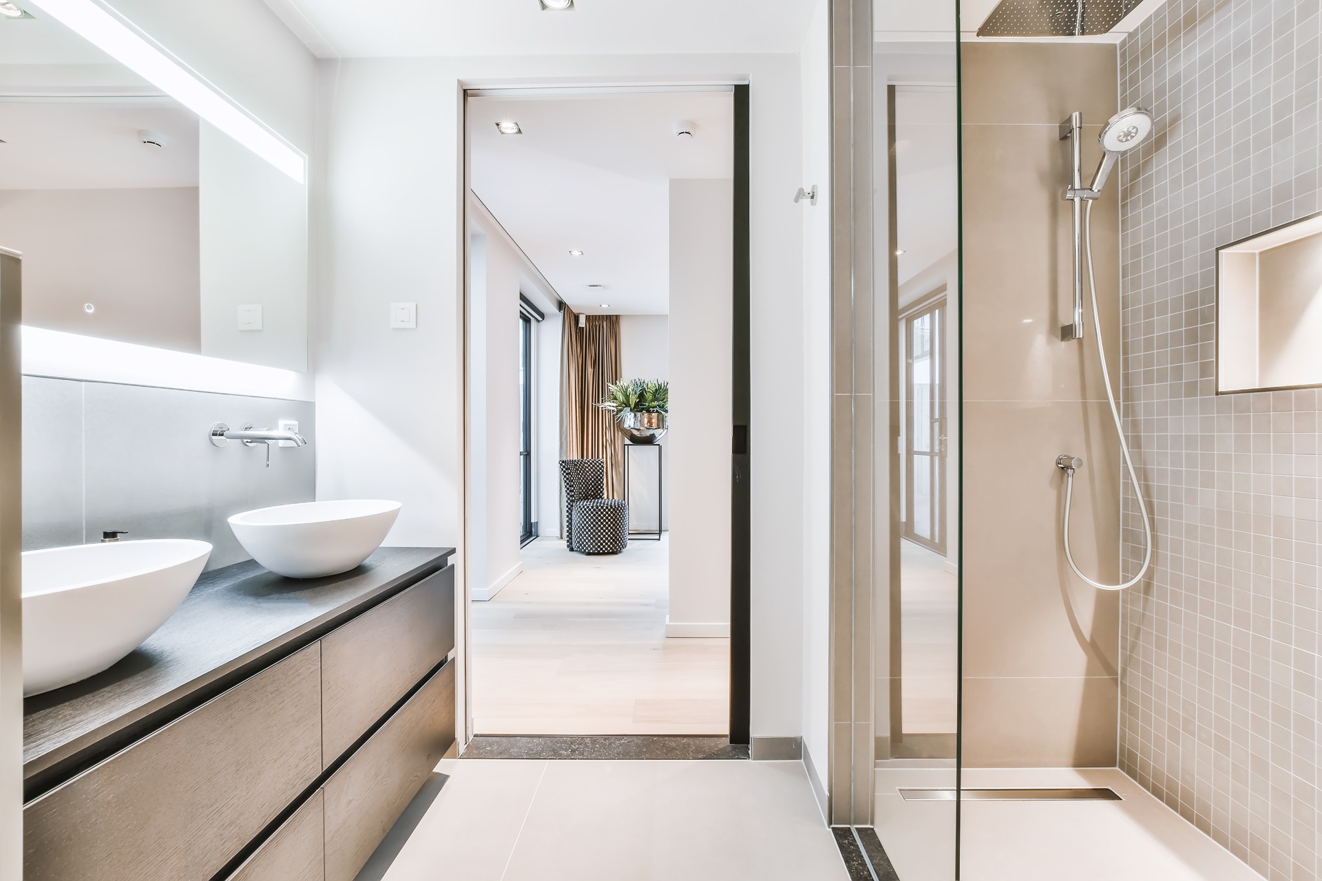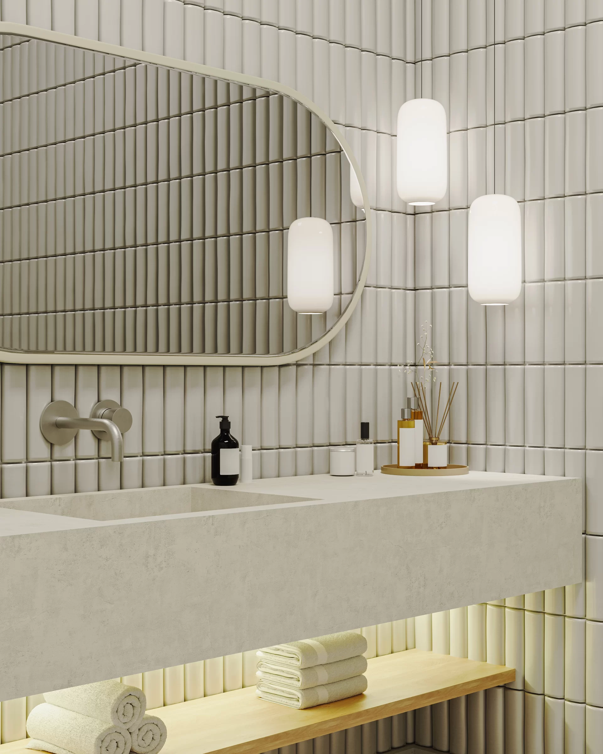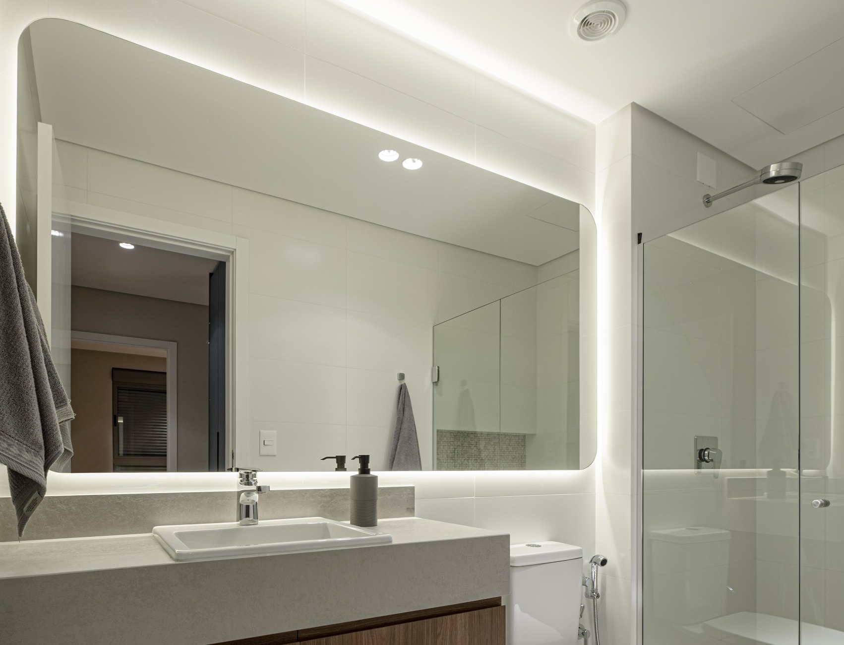 - Espelhos grandes: ampliam o espaço e são uma peça-chave em qualquer banheiro moderno.
