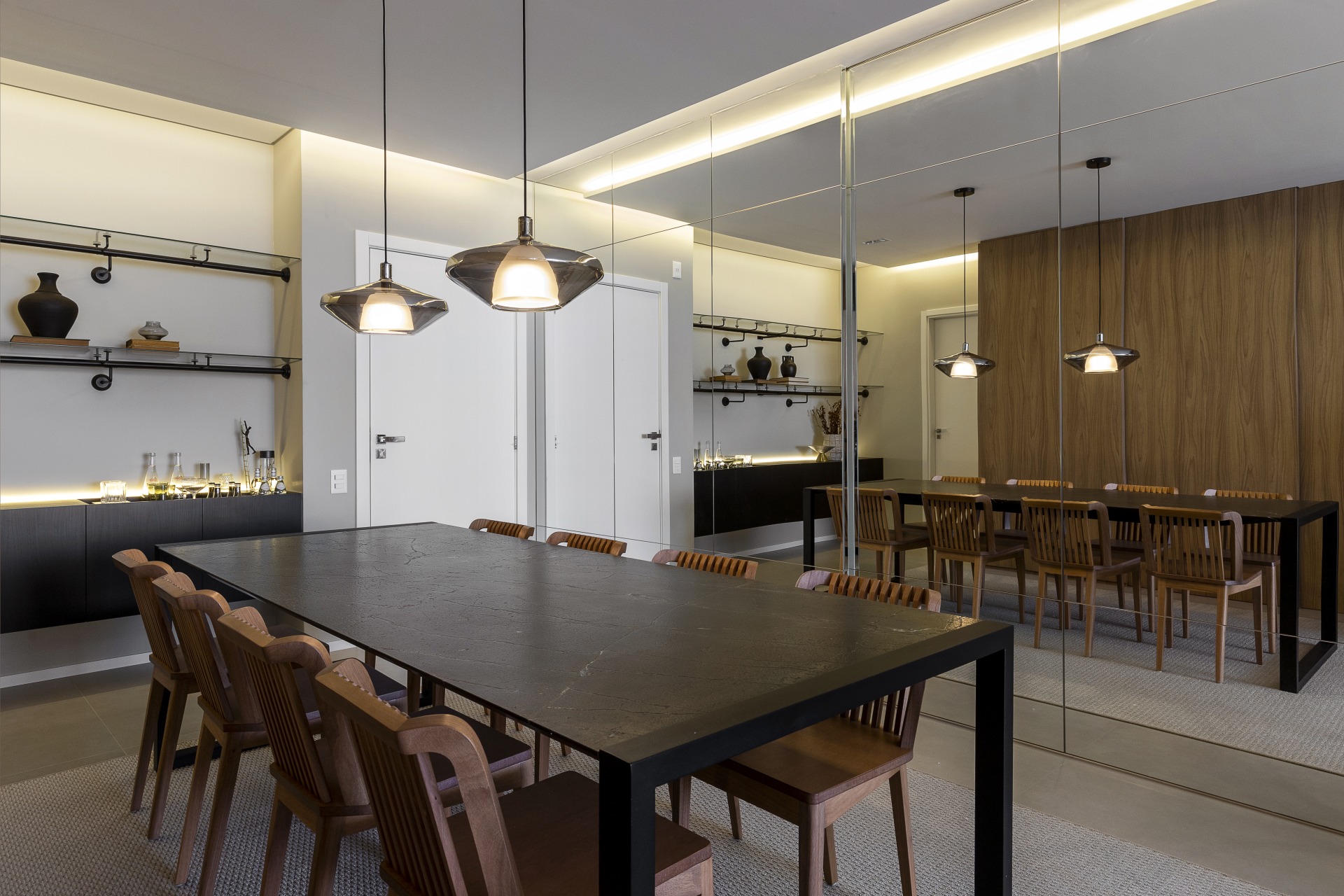 Lustres pendentes proporcionam uma iluminação elegante e direcionada sobre a mesa, criando um ambiente acolhedor.