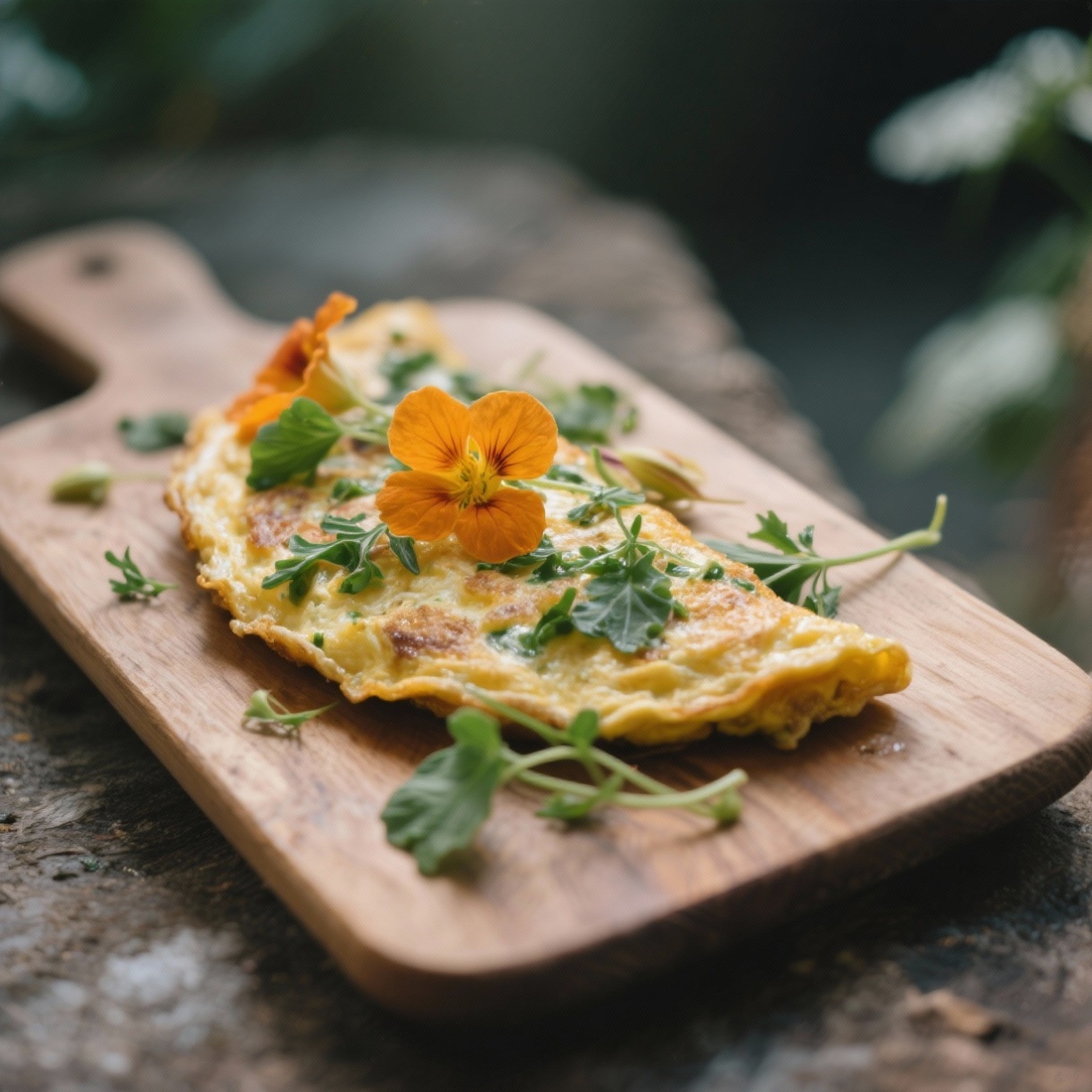 - Finalização: quando a omelete estiver quase pronta, firme por baixo, mas ainda úmida por cima, adicione as folhas jovens picadas e as pétalas de capuchinha, dobrando a omelete ao meio para servir.