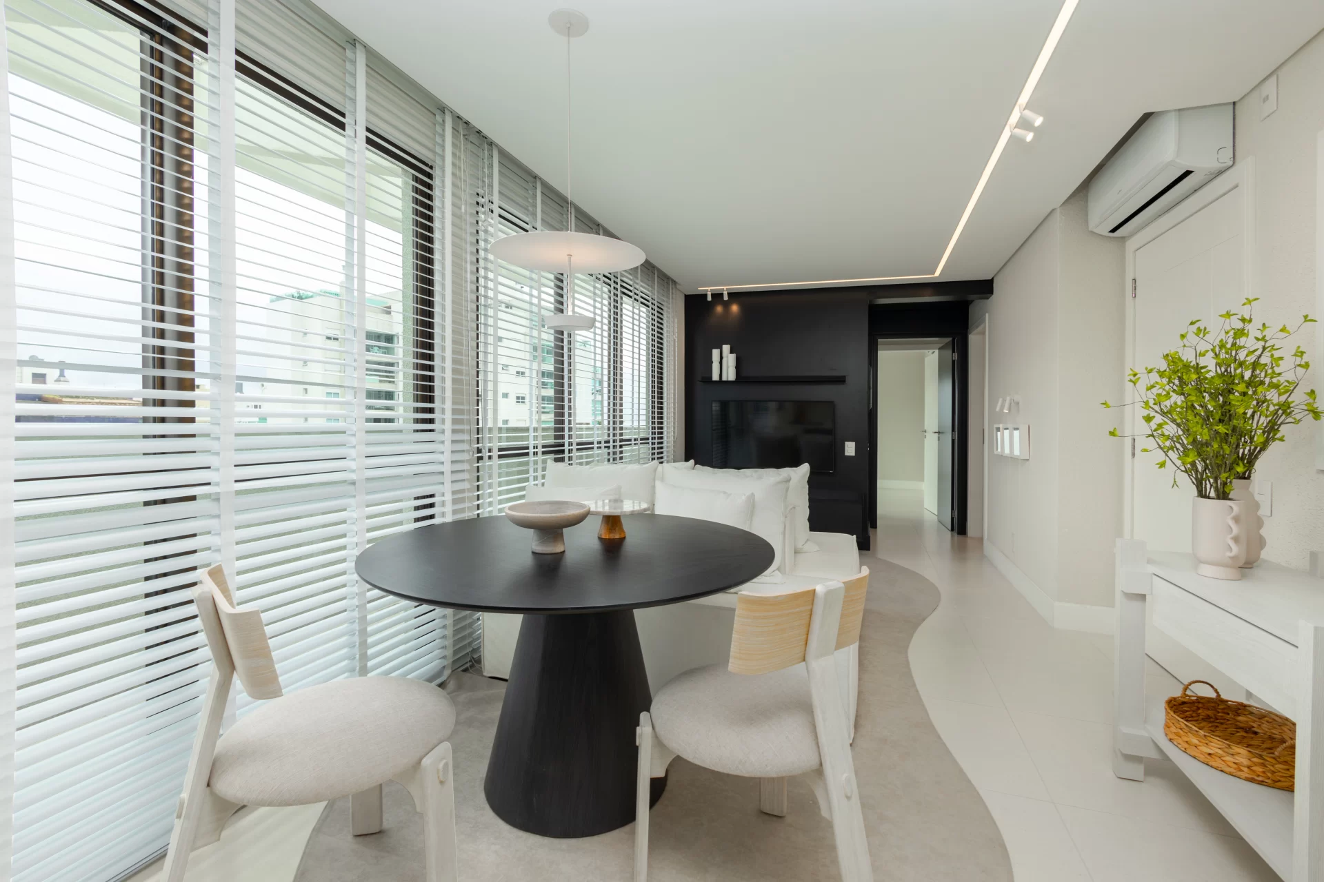 A equipe da arquiteta Beatriz Zeglin projetou a leveza da unidade a unidade 1201A, do eStúdio, com base no conceito minimalista, por meio da pureza dos materiais e formas retas dos móveis. O contraste entre luz e cores, claro e escuro, ressignifica e resgata o que realmente importa dentro de casa. Na área do living, um sofá de dois lados serve de apoio para a área de TV e mesa de jantar. Uma caixa preta pintada é utilizada para camuflar o corredor e dar a sensação de painel de TV mais amplo.