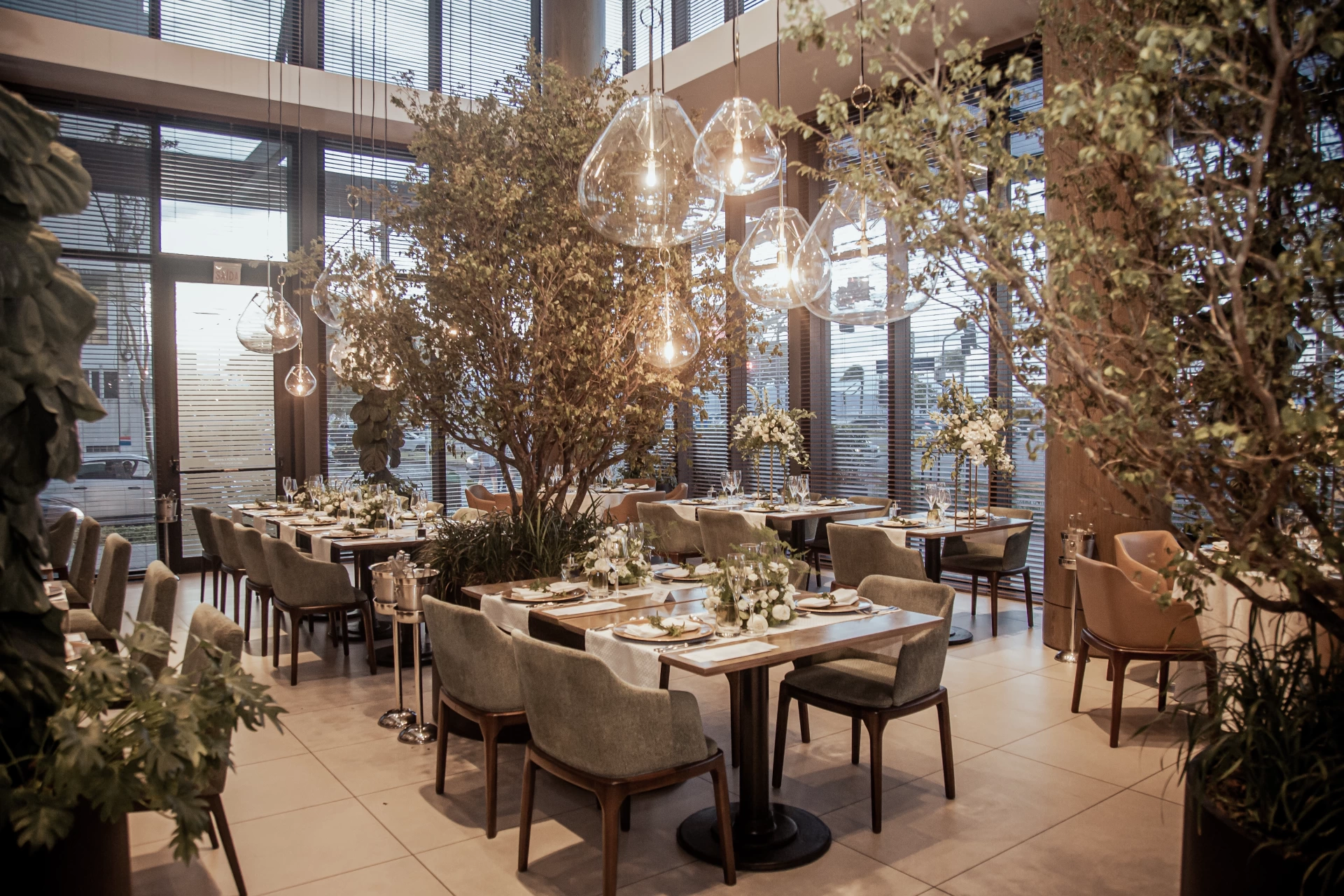 Prefira arranjos com flores brancas (rosas, lírios, orquídeas) e folhagens discretas. Para um efeito moderno, use vasos em vidro transparente ou geométricos e evite arranjos muito altos que impeçam a conversa na mesa.