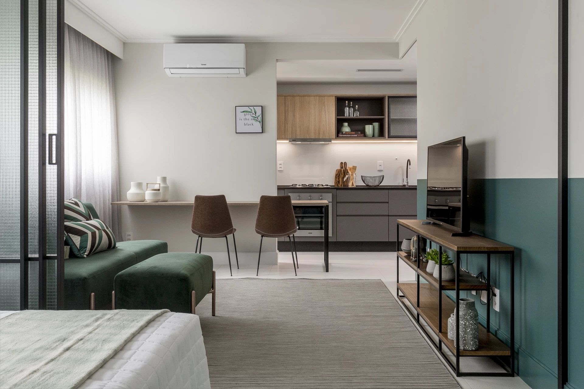 Uma ilha central não é apenas um elemento funcional para preparo de alimentos e armazenamento, mas também serve como um divisor natural e elegante, sem bloquear completamente a visão entre os ambientes. Uma ilha com bancada em materiais nobres como granito ou quartzo, e com um design que harmonize com os armários planejados, pode ser um ponto focal sofisticado e uma divisória sutil. Mas lembre-se de conferir se há a possibilidade de colocar a ilha, pois terá a necessidade de haver pontos de gás no piso (para quem for colocar fogão na ilha).