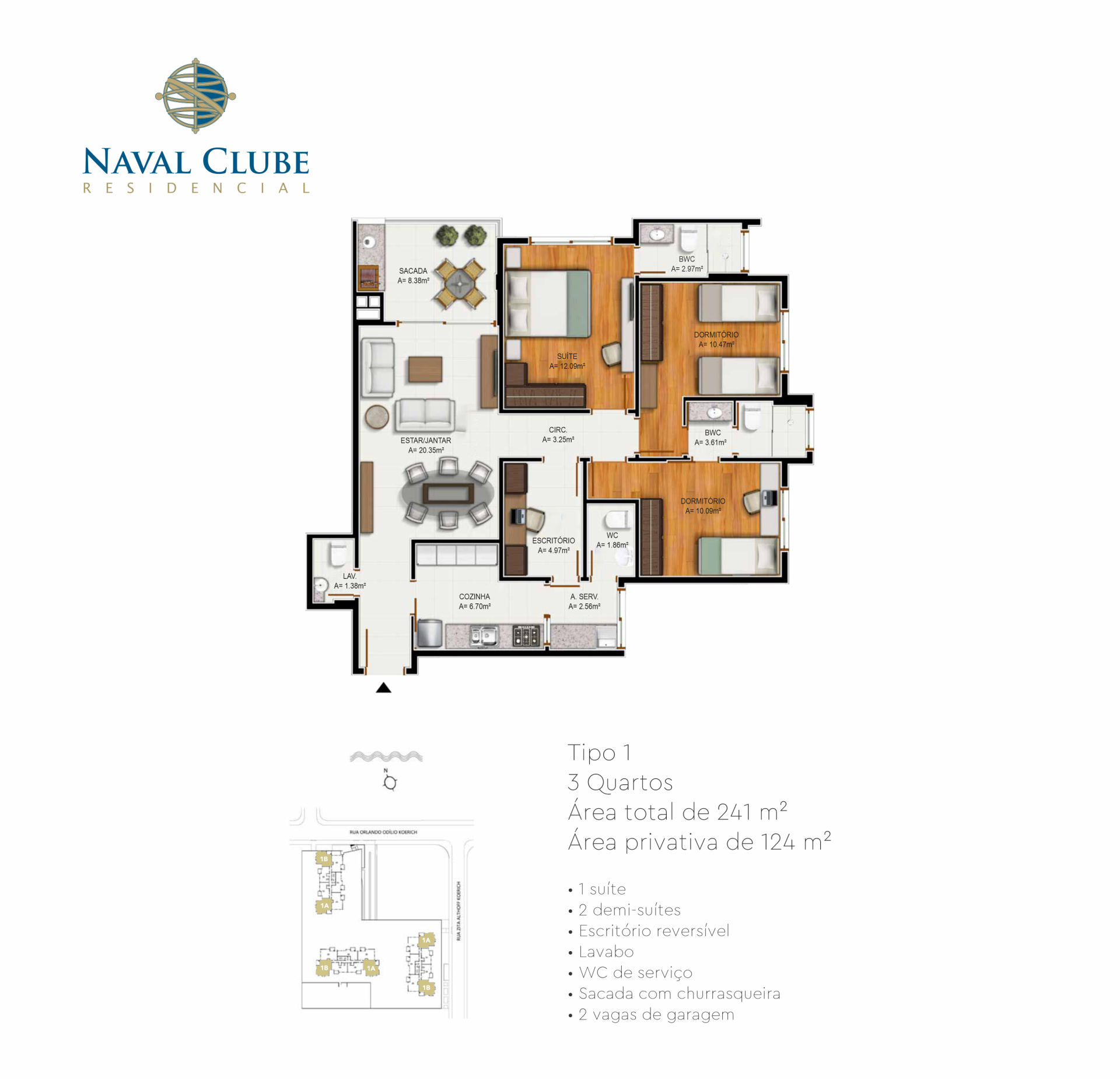 Área total: 241m² Área privativa: 124m² 1 Suíte Lavabo WC de serviço Sacada com churrasqueira 2 Vagas de garagem