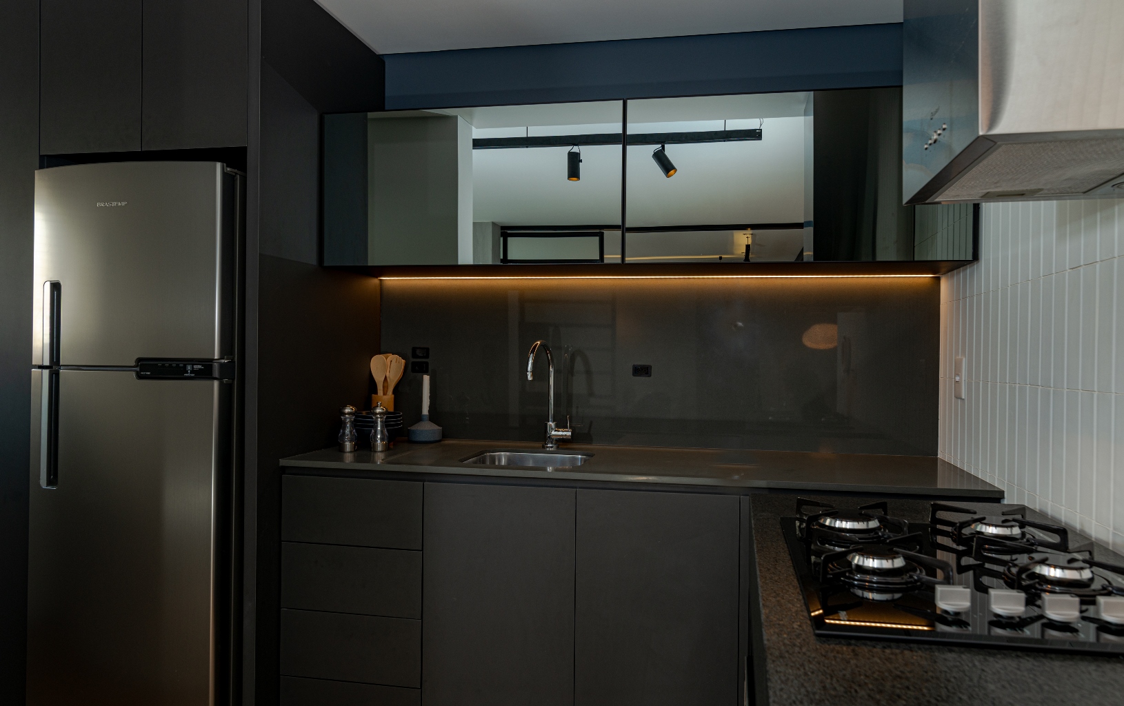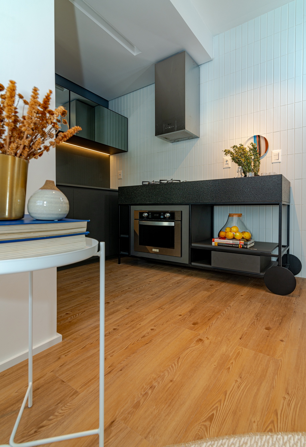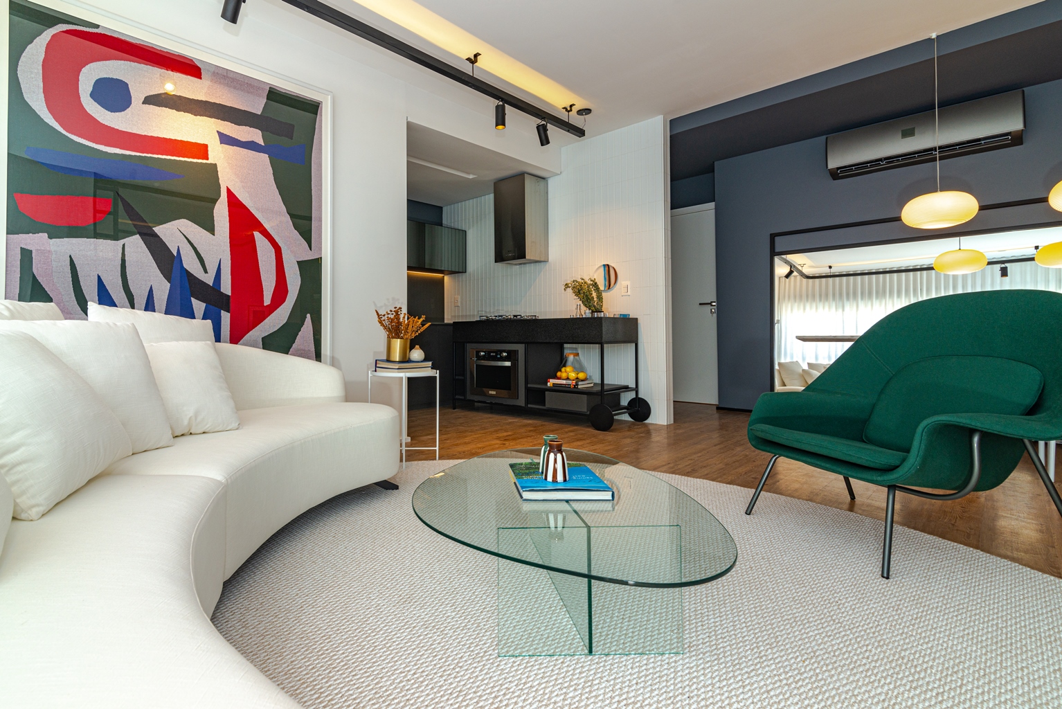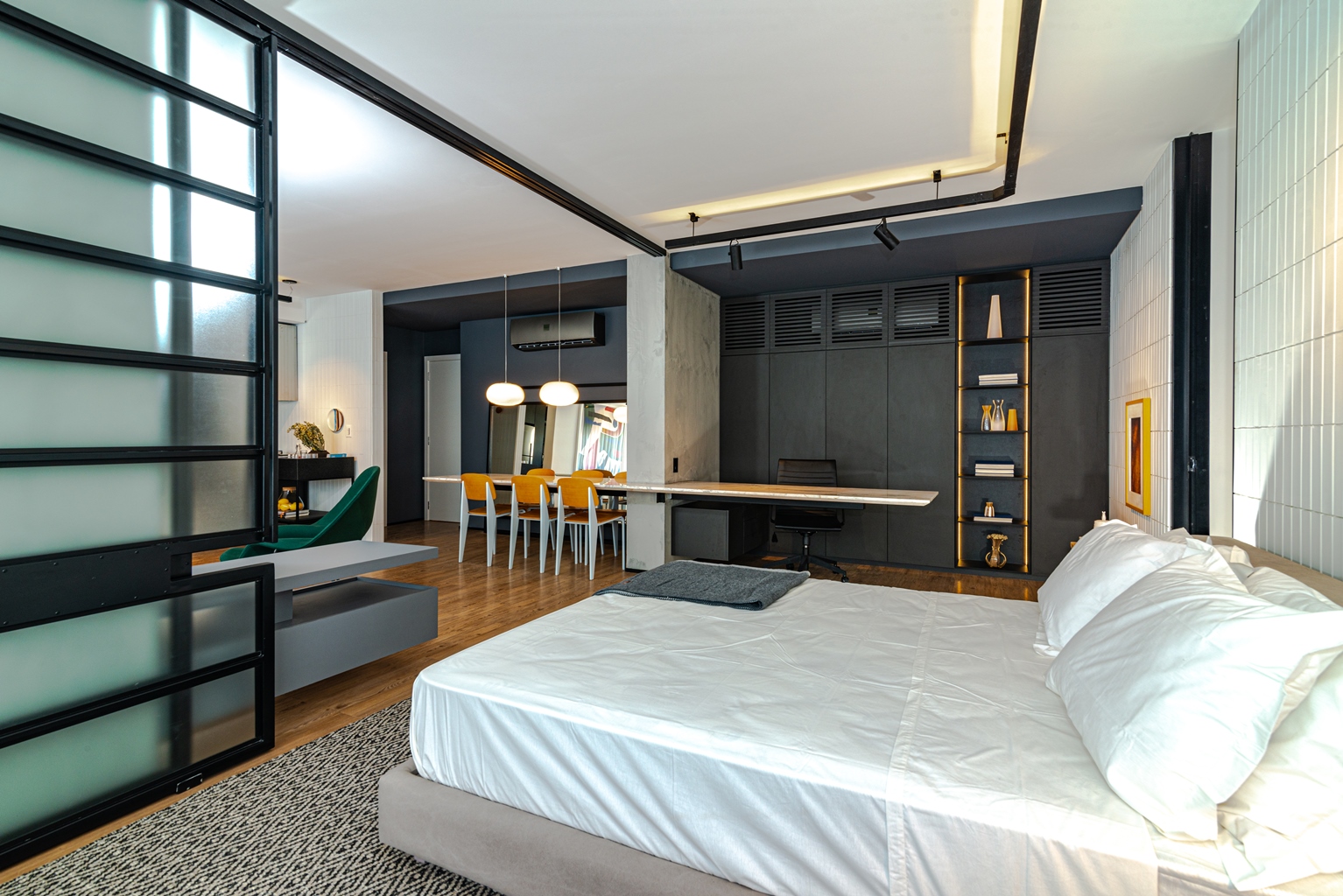 Este Super eStúdio é moderno e surpreendente. Ampla sala de estar e jantar para 6 pessoas, espaço para Home Office e divisória para dar privacidade para o dormitório. Para os amantes de moda, o closet irá encantar pelo tamanho e funcionalidade.