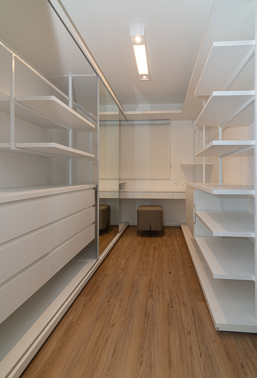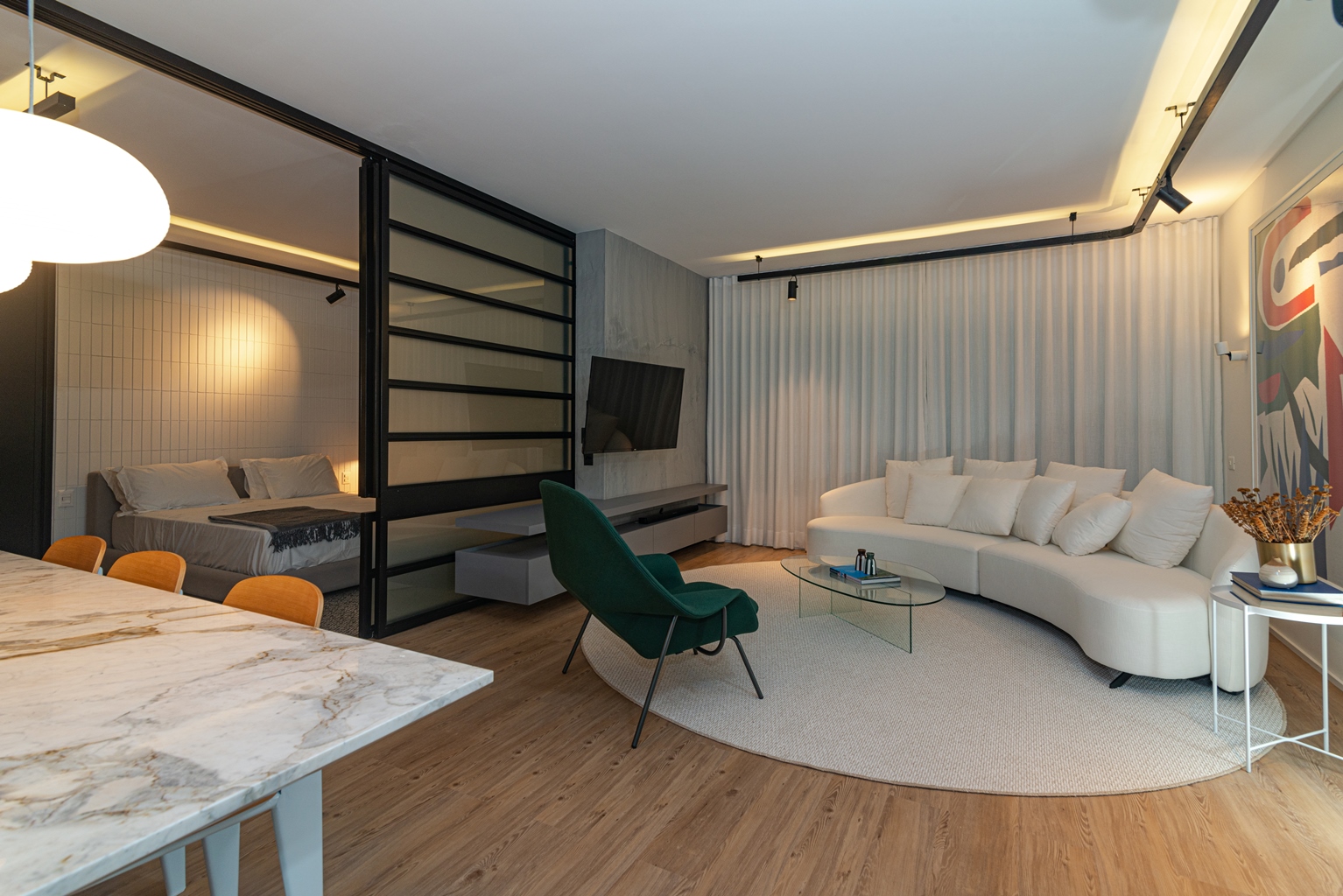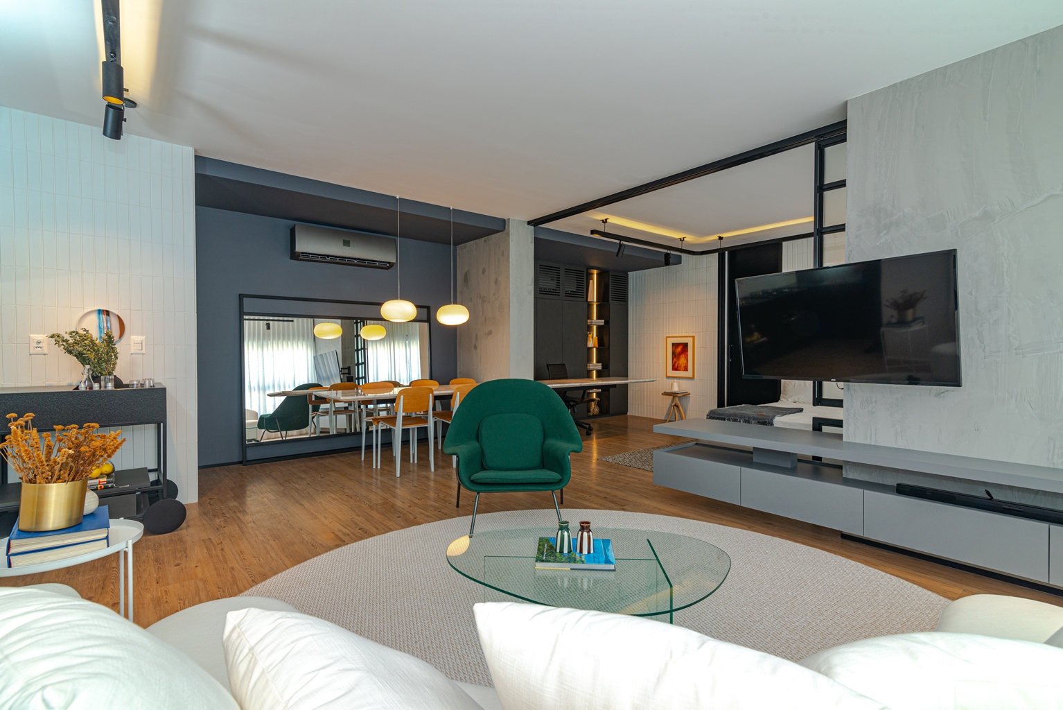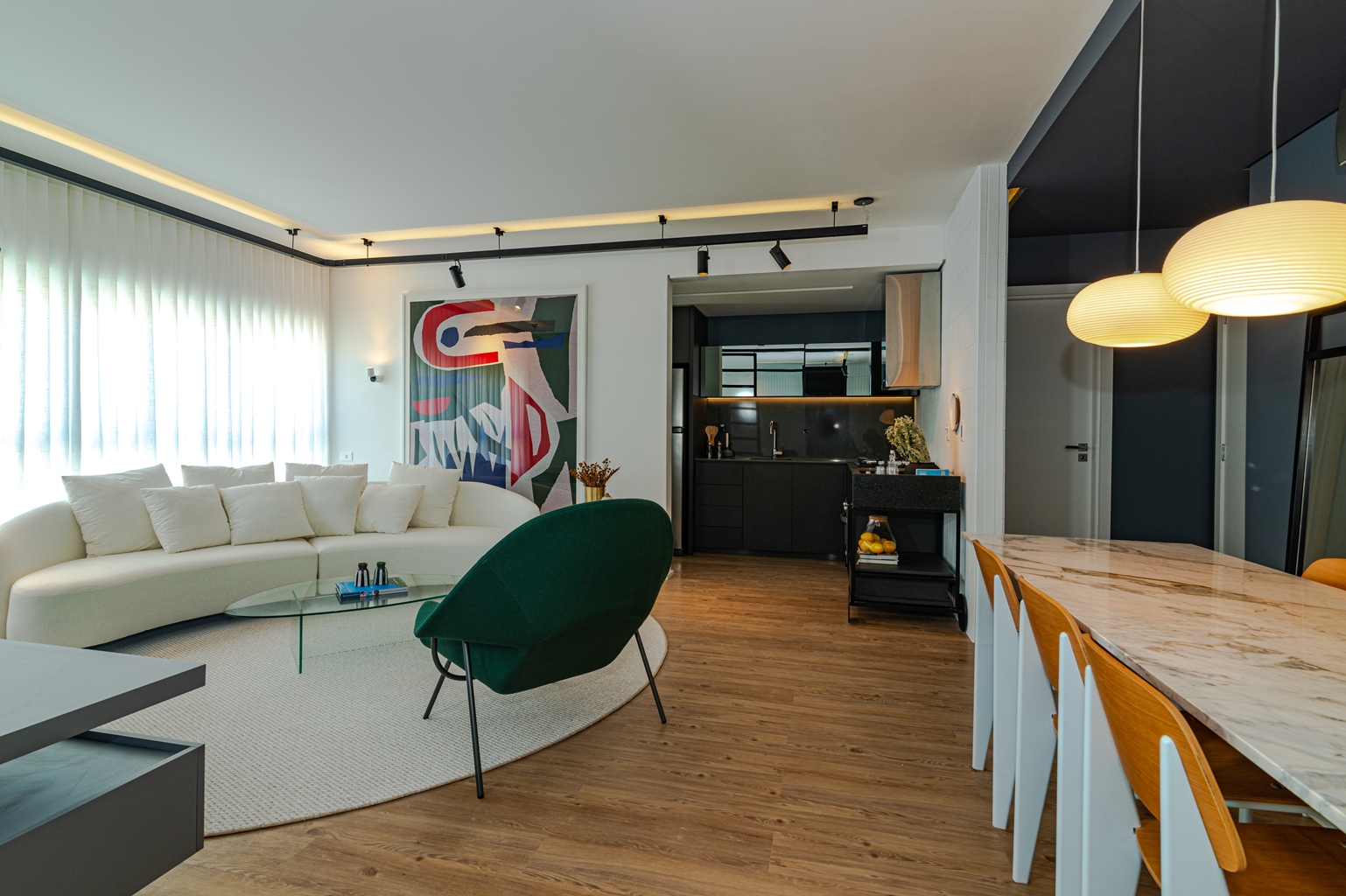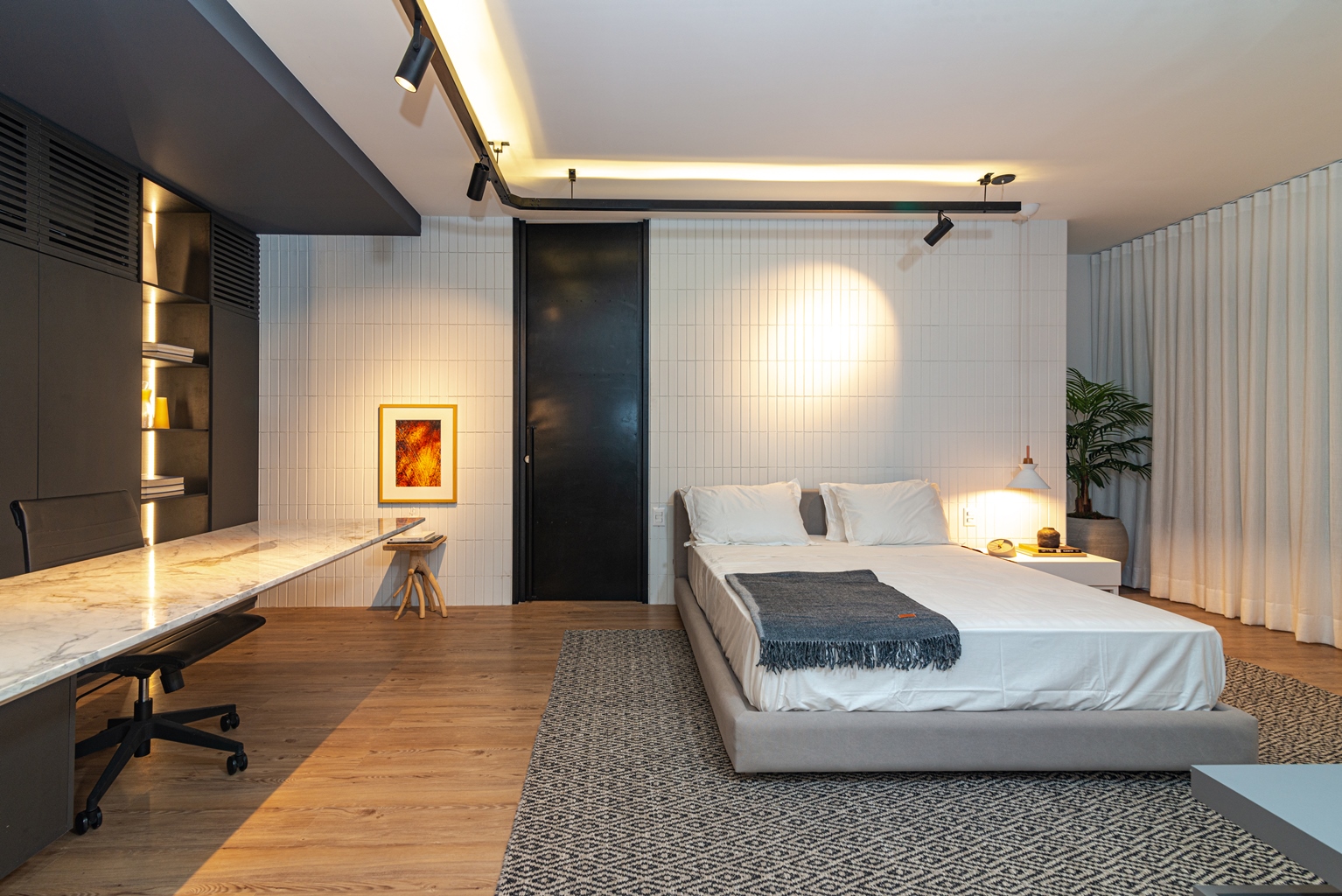 Este Super eStúdio é moderno e surpreendente. Ampla sala de estar e jantar para 6 pessoas, espaço para Home Office e divisória para dar privacidade para o dormitório. Para os amantes de moda, o closet irá encantar pelo tamanho e funcionalidade.