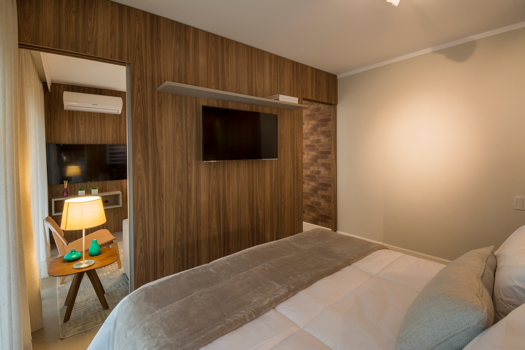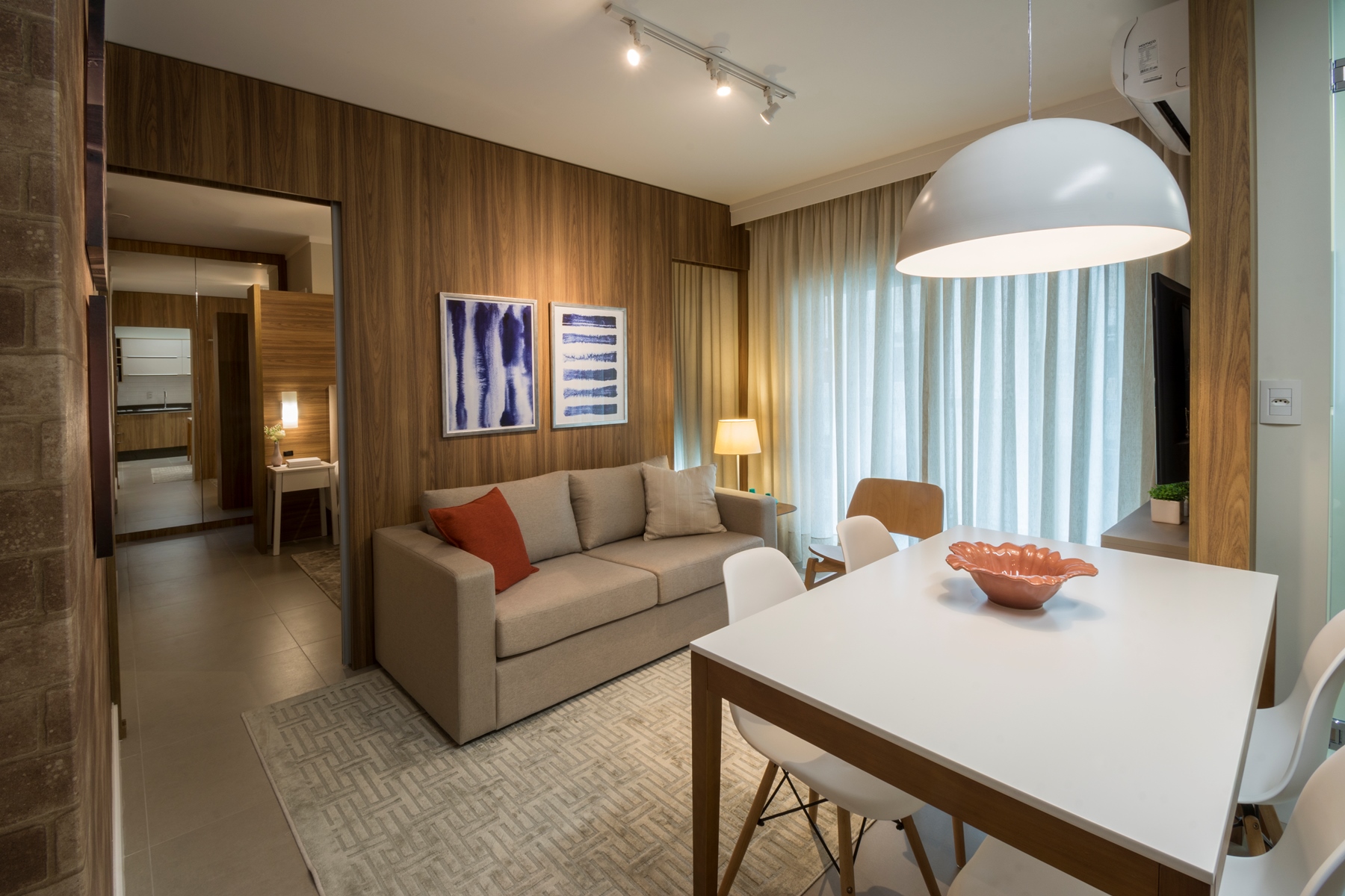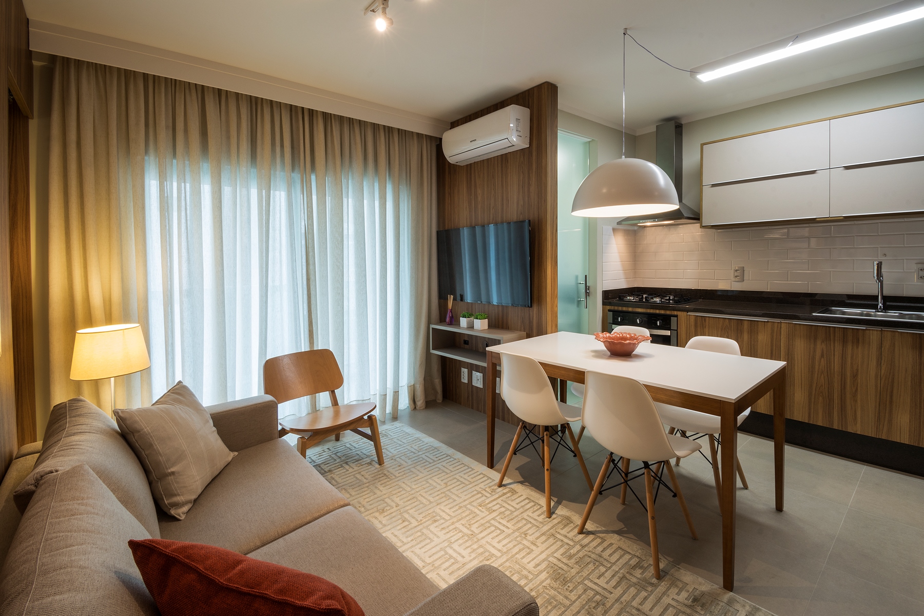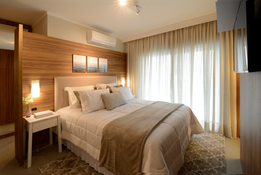 O aconchego do apartamento é garantido por uma boa dose de luz indireta e bem direcionada, destacando cada cantinho deste lindo eStúdio, com tapetes e cortinas de tecidos de tons crus e neutros que trazem naturalidade para o ambiente.