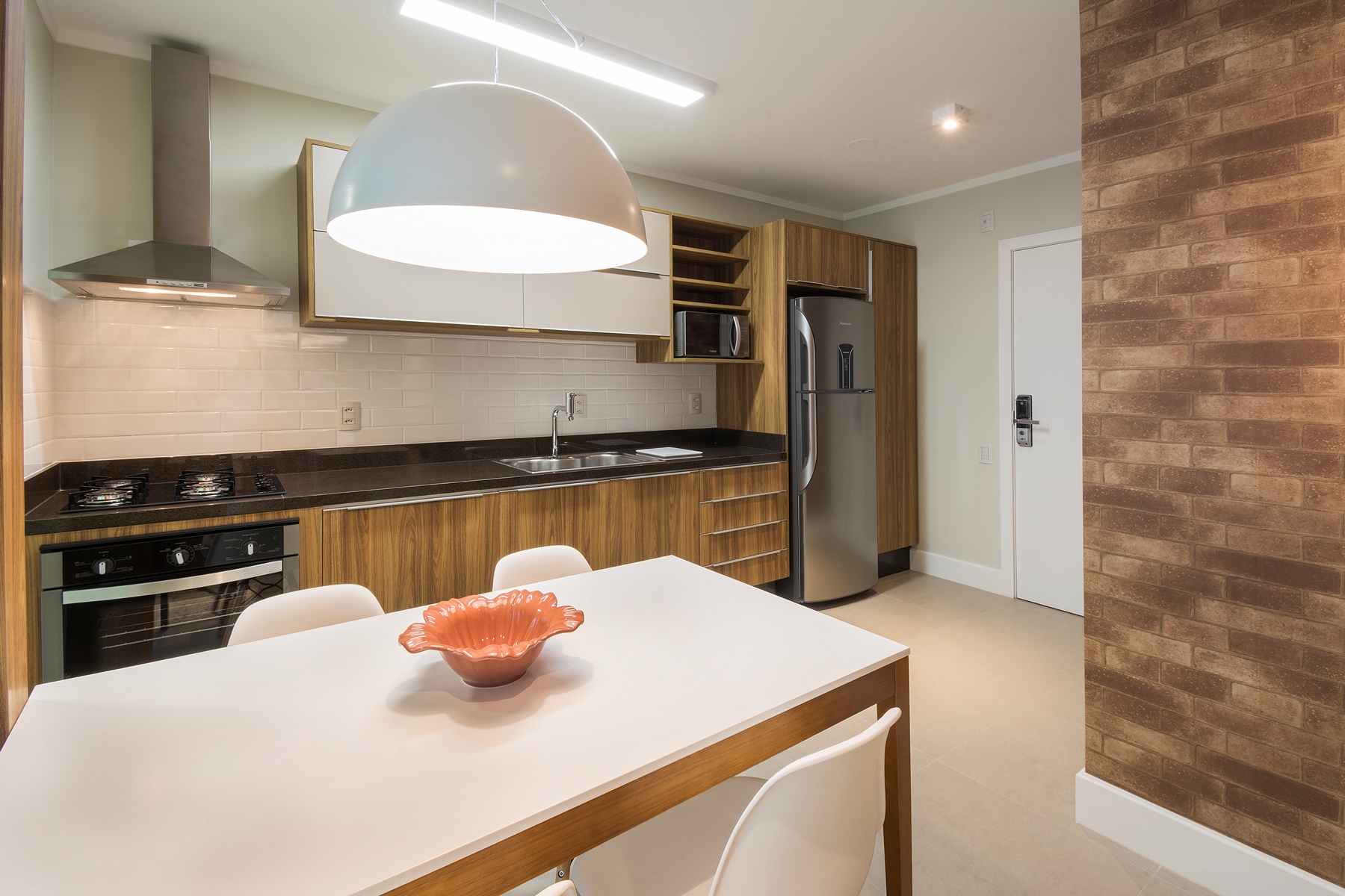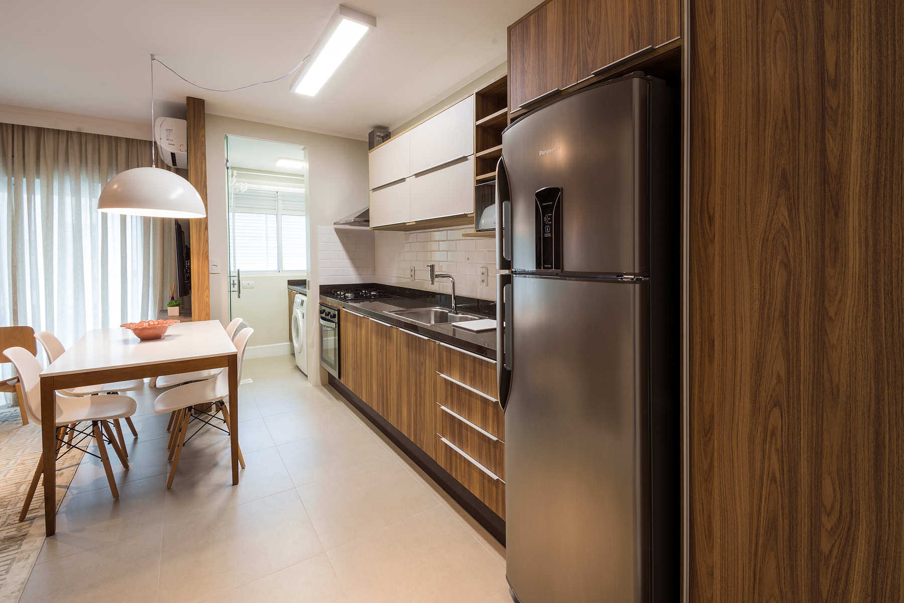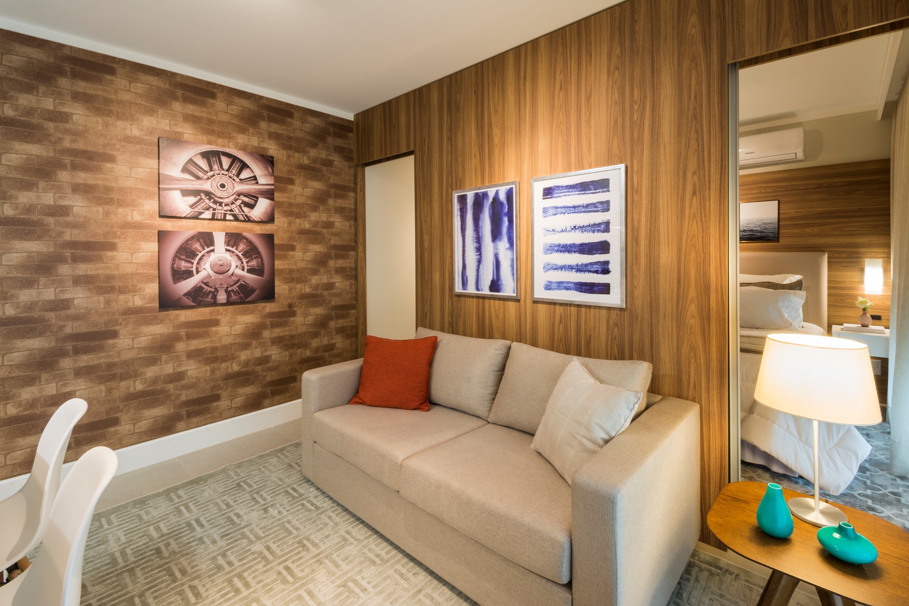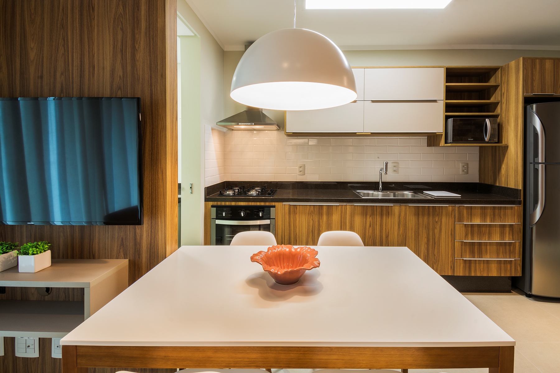 O aconchego do apartamento é garantido por uma boa dose de luz indireta e bem direcionada, destacando cada cantinho deste lindo eStúdio, com tapetes e cortinas de tecidos de tons crus e neutros que trazem naturalidade para o ambiente.