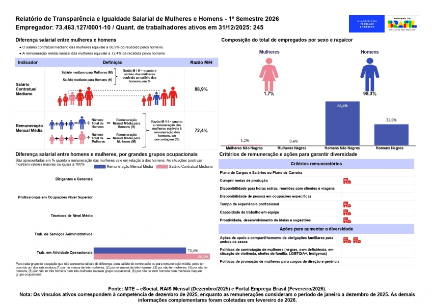 De acordo com a Lei de Igualdade Salarial (Lei nº 11.795/23), a Koerich Construtora LTDA, integrante do grupo WKoerich, reafirma seu compromisso em fomentar a transparência e a equidade no ambiente de trabalho. Dentro deste compromisso, apresentamos o relatório de igualdade salarial referente ao 1º semestre de 2026. Ele foi elaborado com base nas informações coletadas pelo Ministério do Trabalho e Emprego através do eSocial, RAIS e Portal Emprega Brasil.